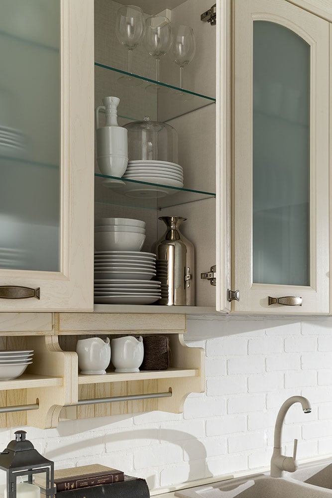 Le ante della cucina Memory sono di manifattura pregevole, di spessore 20 mm, con telaio in legno massello di frassino sagomate con testata superiore ad arco e pannello centrale impiallacciato o in vetro.