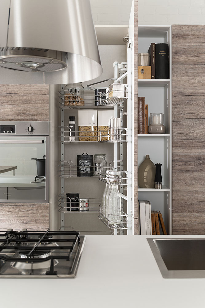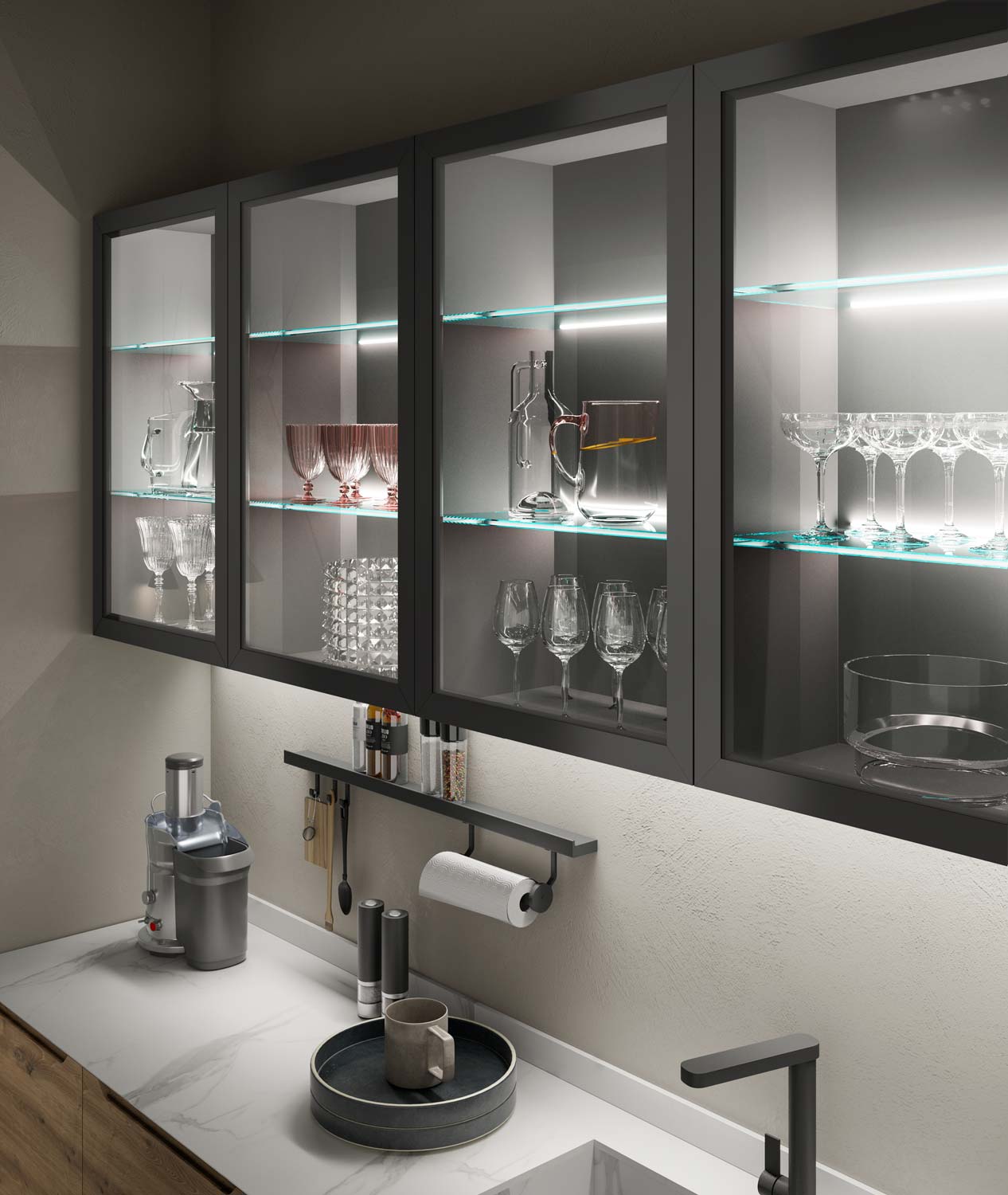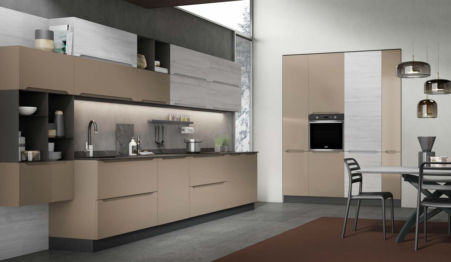 Frutto di un progetto sartoriale, la cucina Carima si impone con la sua particolare maniglia integrata all’anta, proposta nelle finiture lucide, opache e effetto legno.