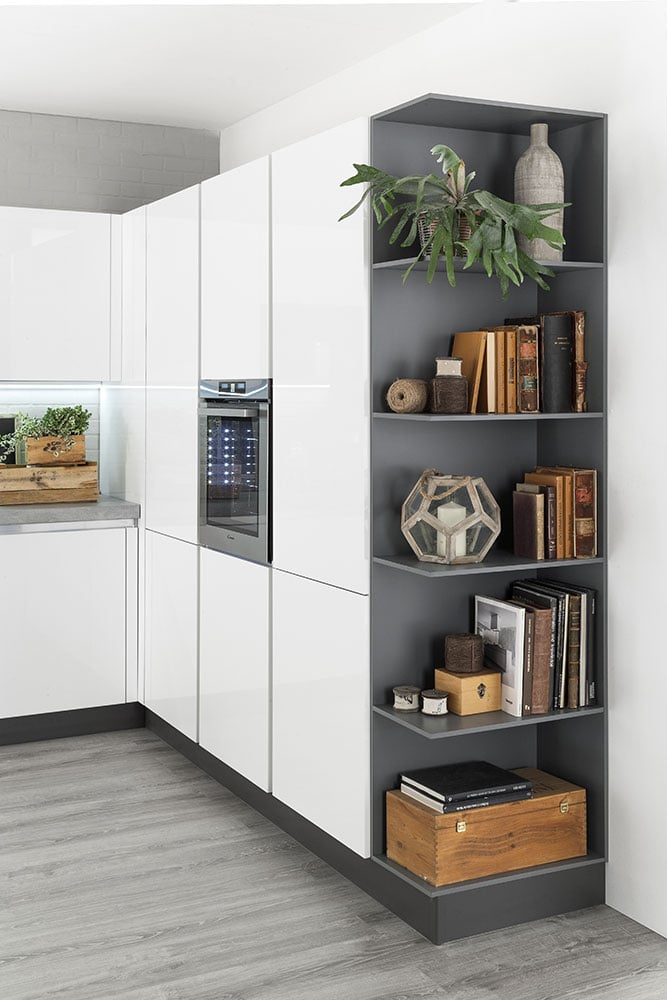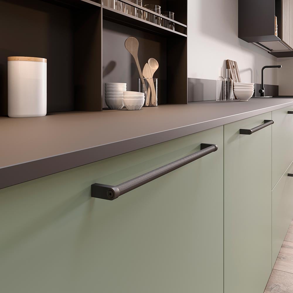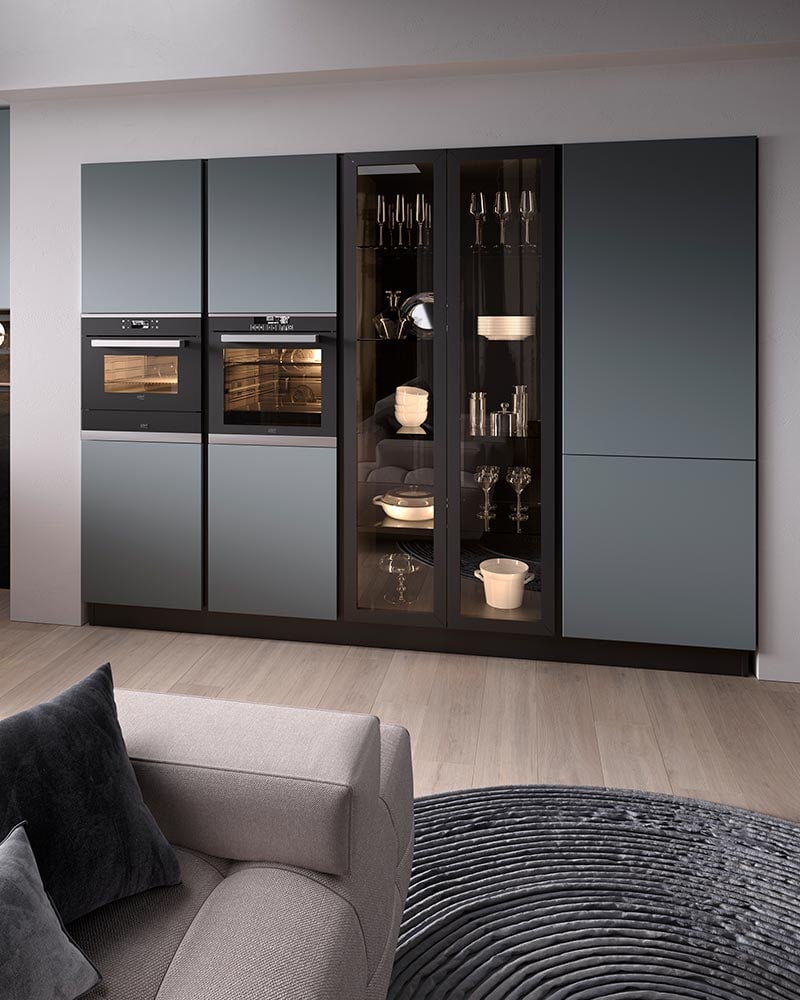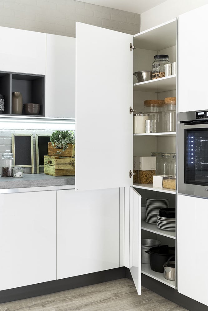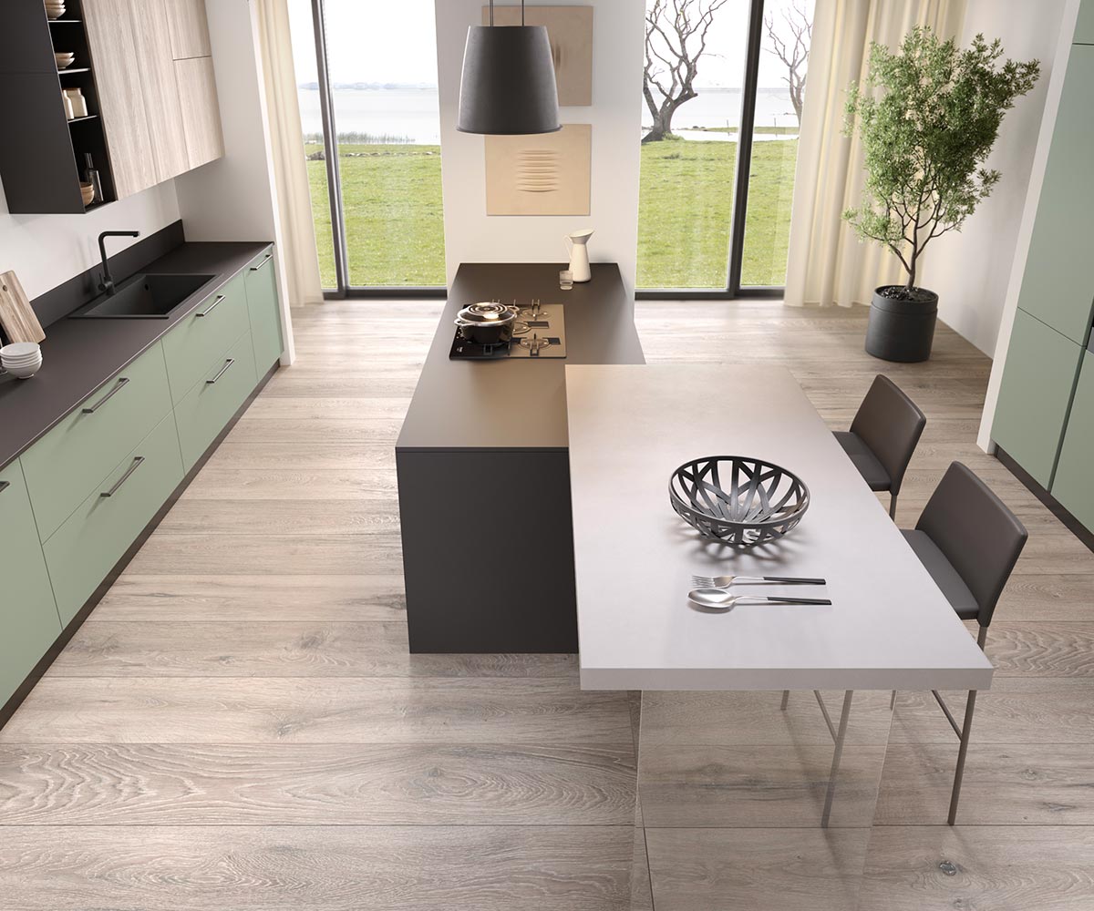 Il programma della cucina Korinna prevede ante squadrate in melaminico barrierato classe E1, spessore 18 mm, con bordo ABS in tinta. La gamma cromatica e la varietà di finiture spaziano dai colori in versione lucida e opaca agli effetti legno o laccato, per consentire la massima libertà creativa e compositiva.