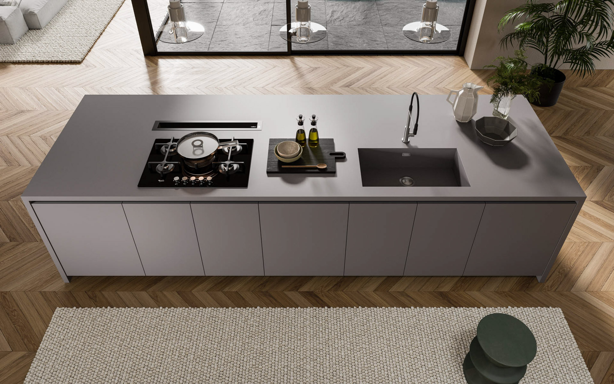 La composizione si fa fluida e concede spazio al contrasto dei differenti materiali per creare un ambiente unico e deciso.