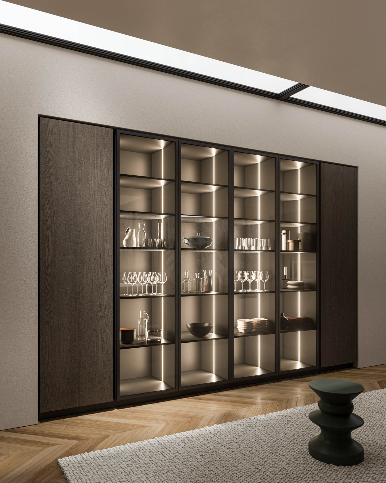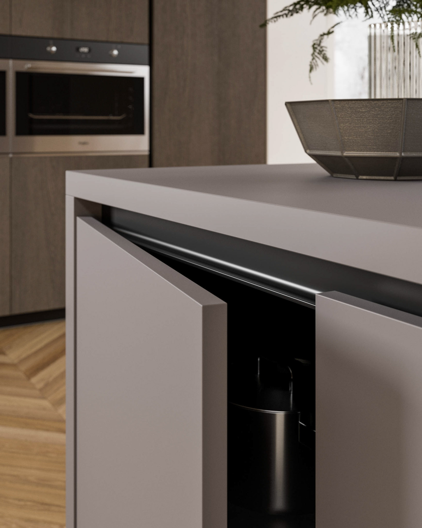 Le tante anime di una cucina parlano attraverso tocchi materici e differenti essenze. Per trasformare gli spazi e disegnare il proprio ambiente: unico, dinamico, vivo, libertà di espressione. Una gola scavata per esaltare le finiture.