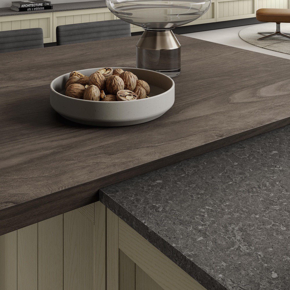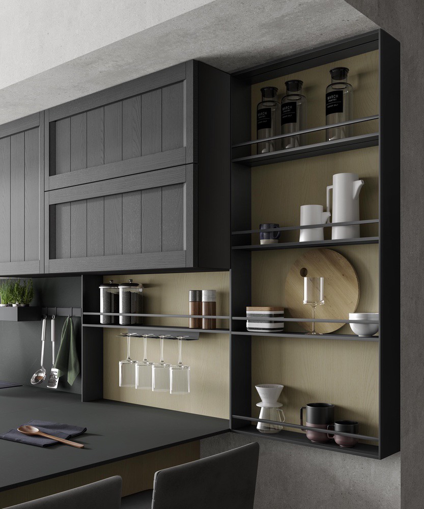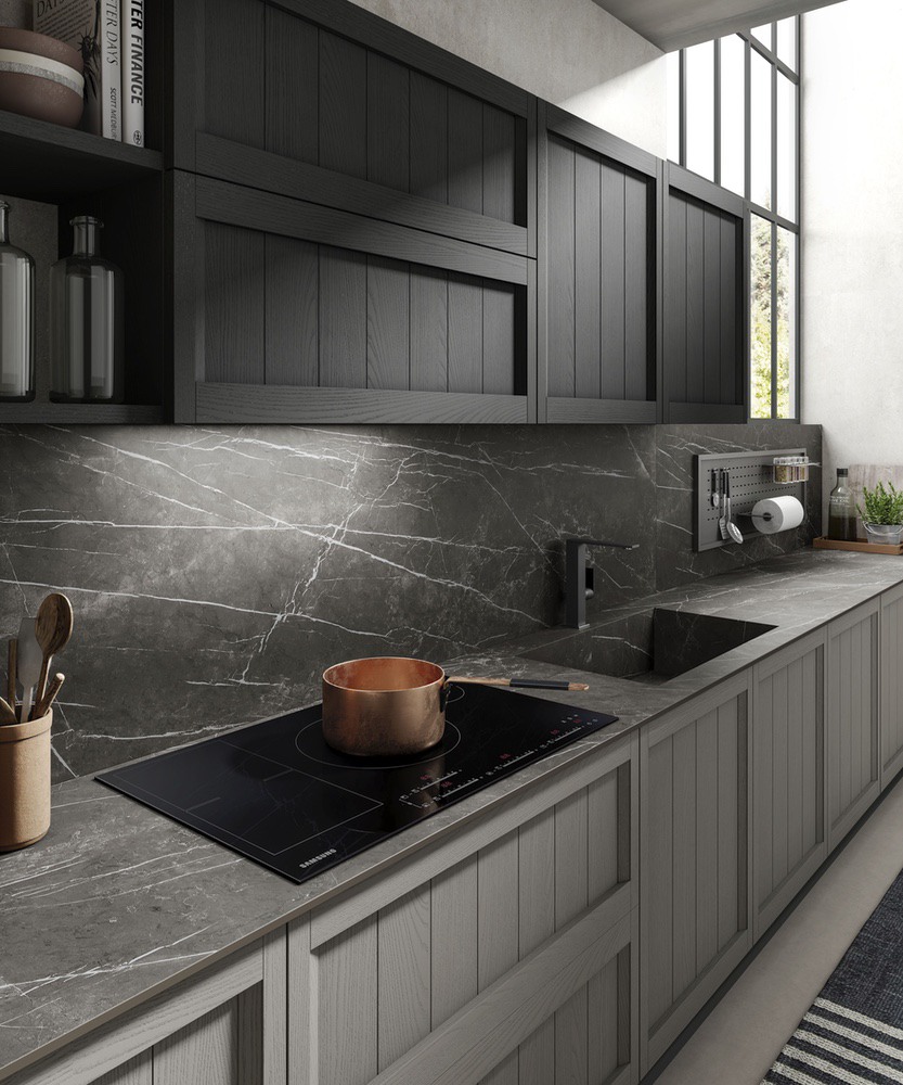 Il programma della cucina Saona prevede ante a telaio in frassino con doghe pantografate e presa maniglia sul traverso, spessore 22 mm.
