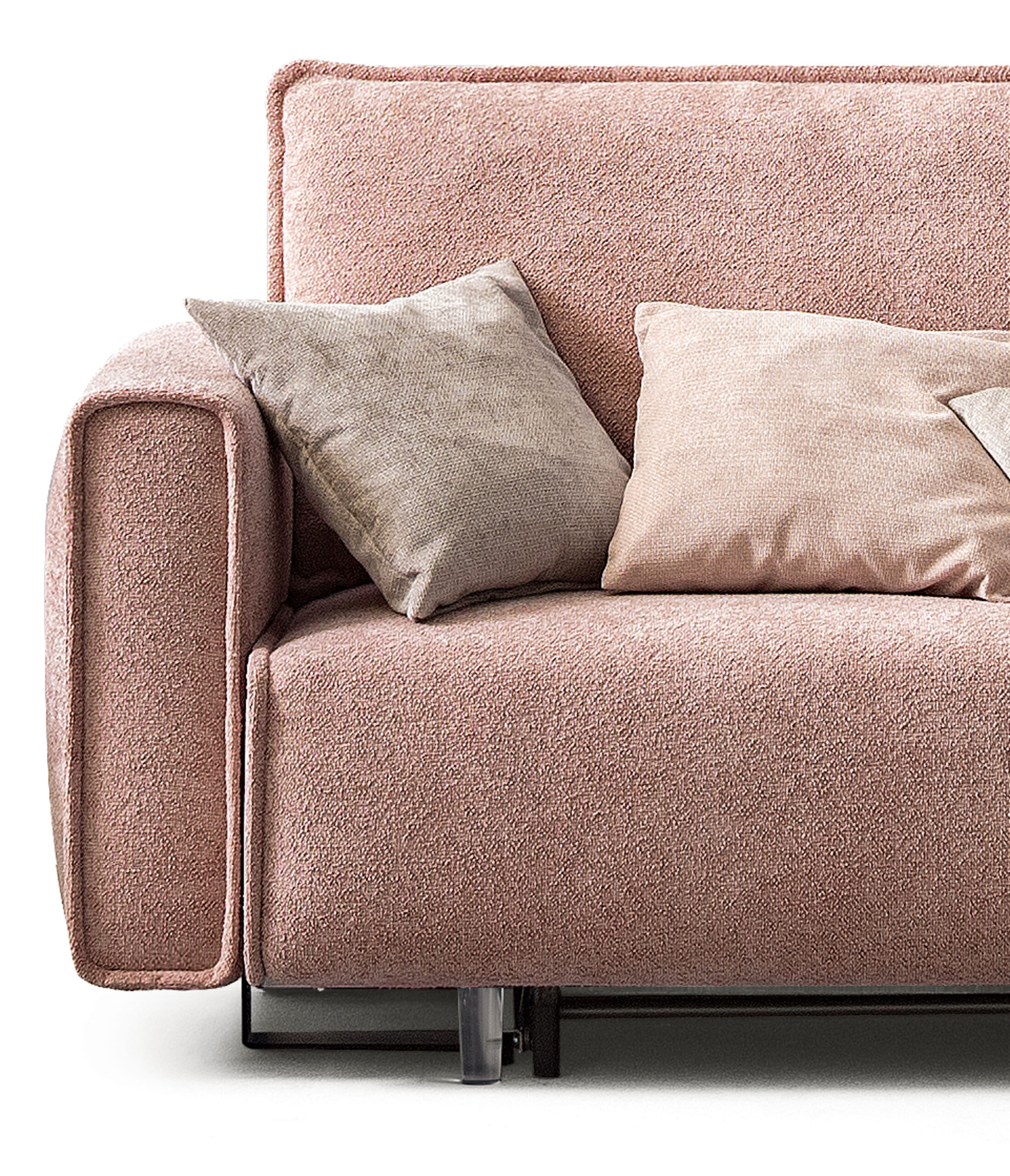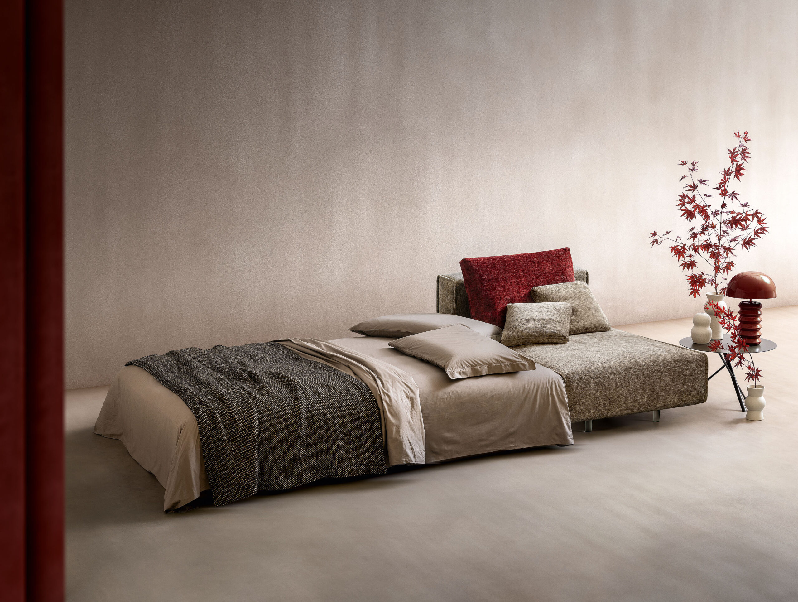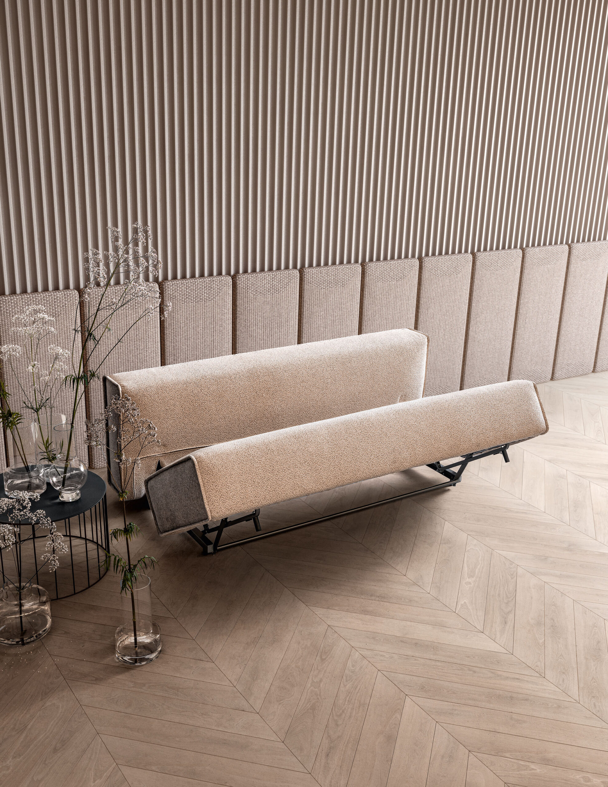 Divano trasformabile dal design elegante che unisce stile e funzionalità. Grazie al sistema innovativo, si trasforma facilmente in un comodo letto con topper opzionale.