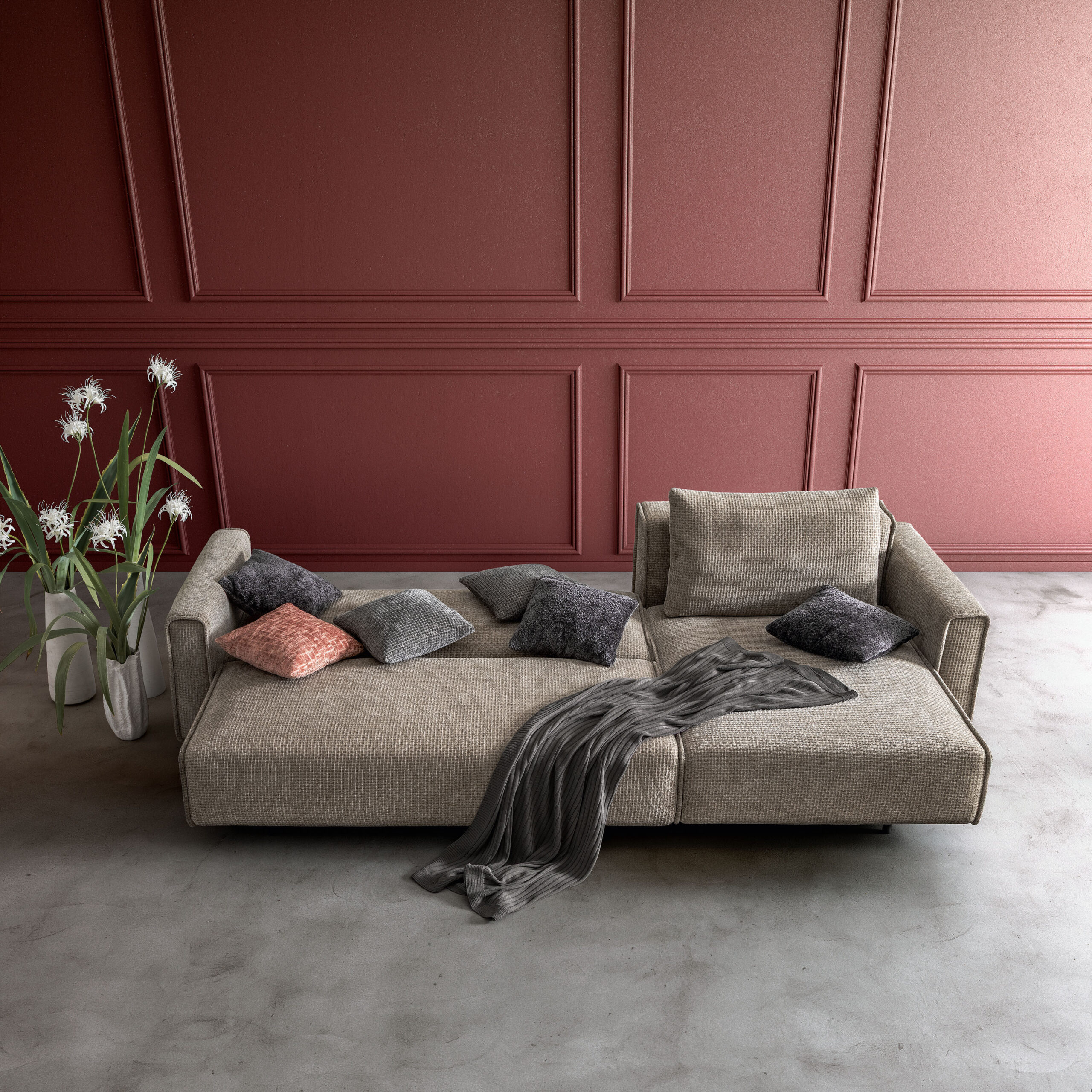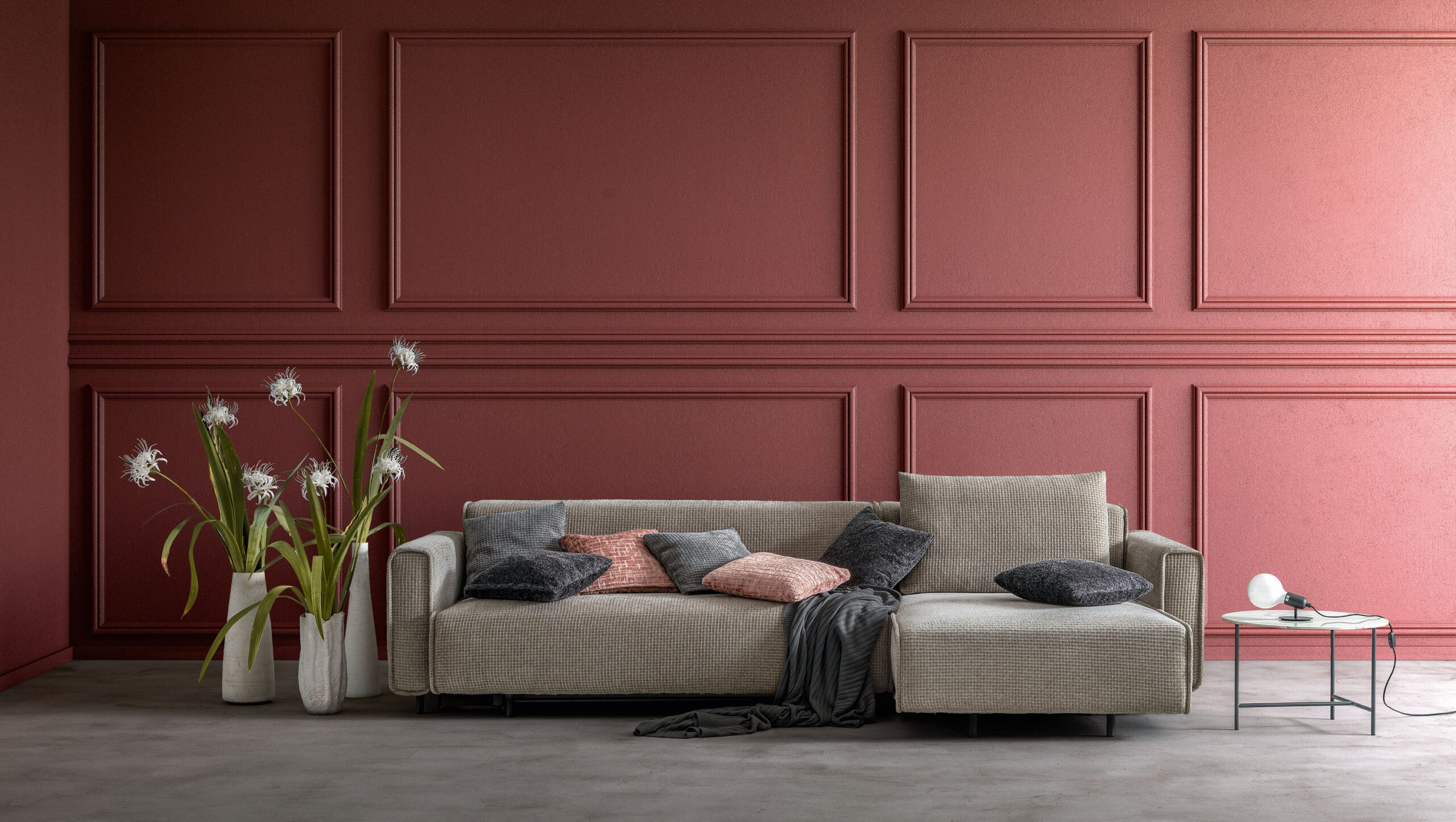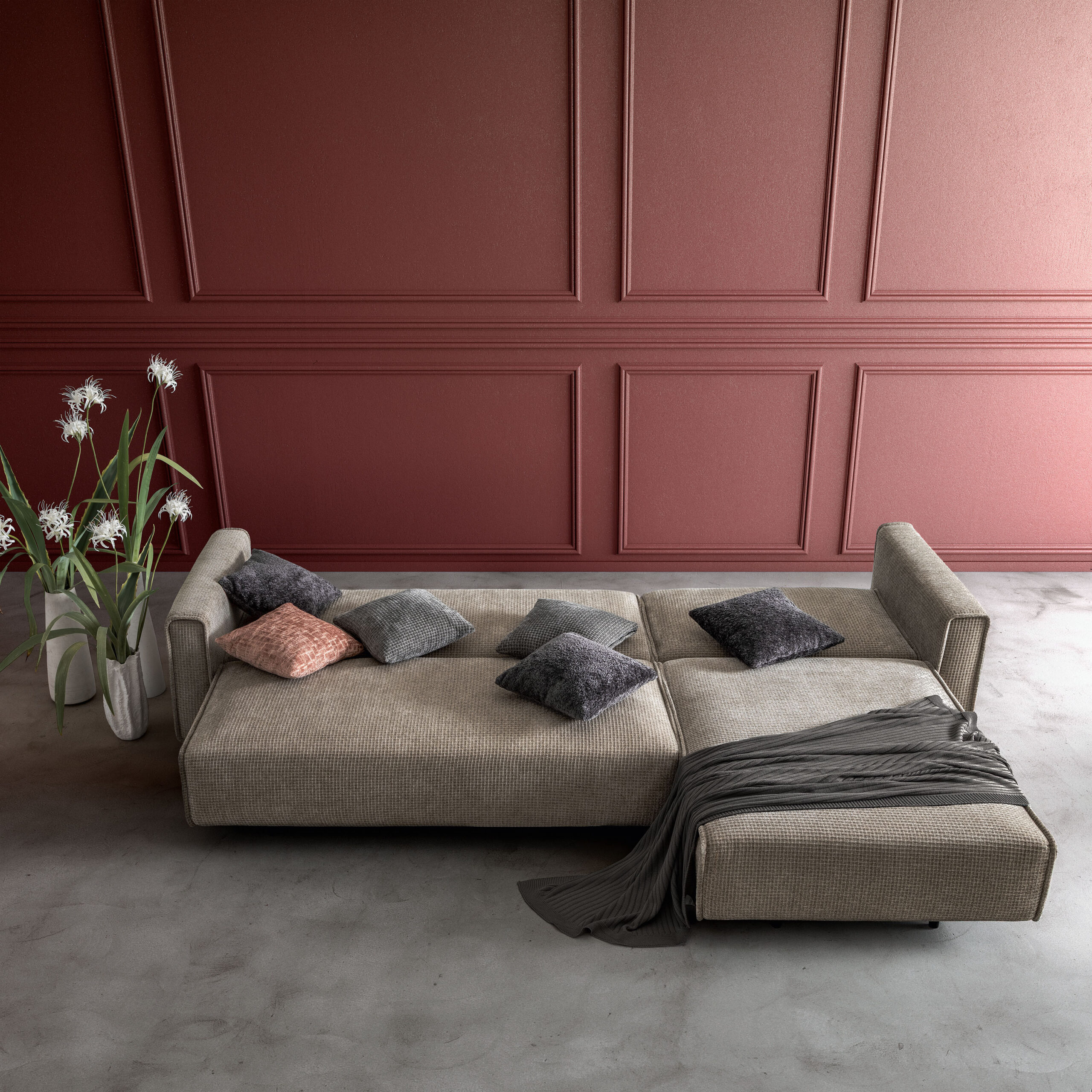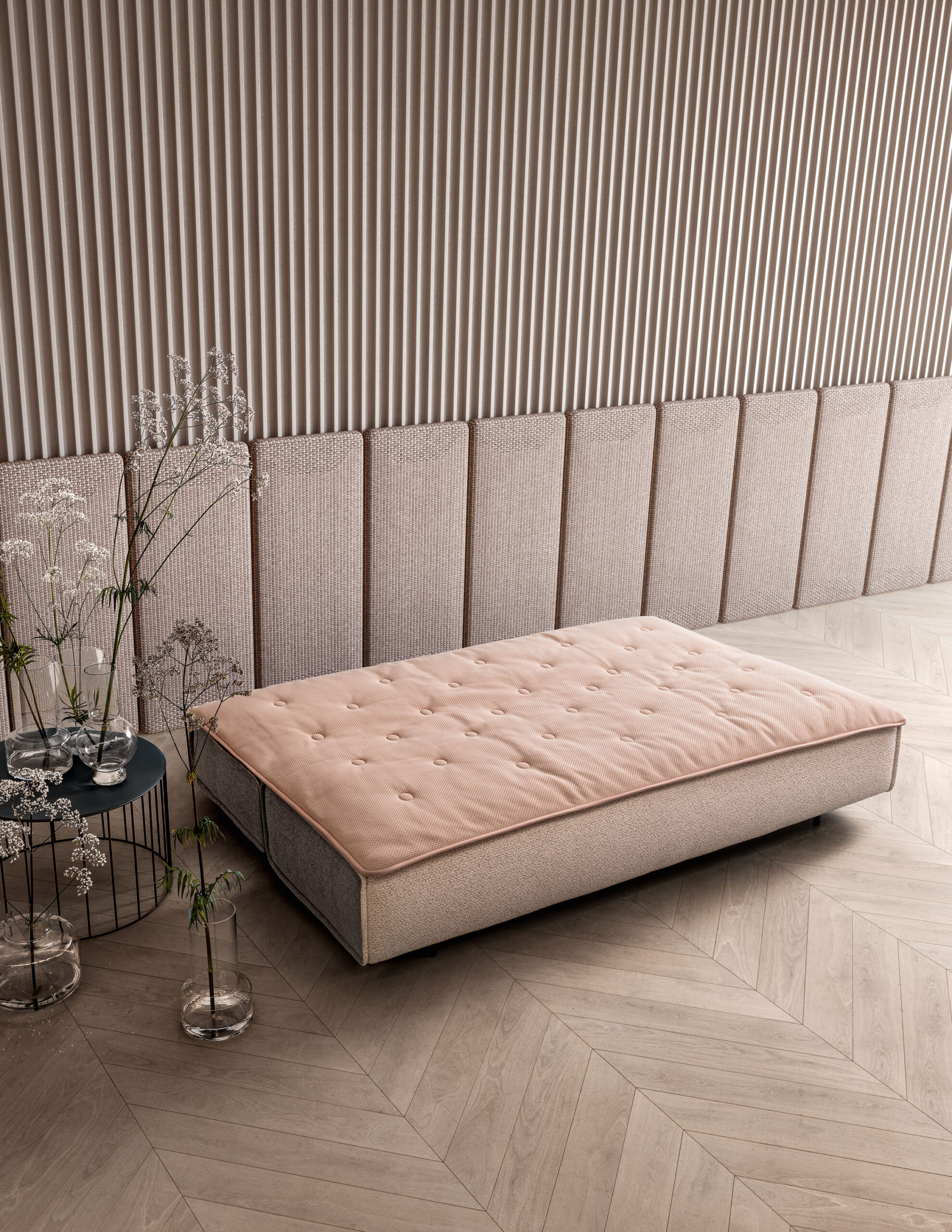 Divano trasformabile dal design elegante che unisce stile e funzionalità. Grazie al sistema innovativo, si trasforma facilmente in un comodo letto con topper opzionale.