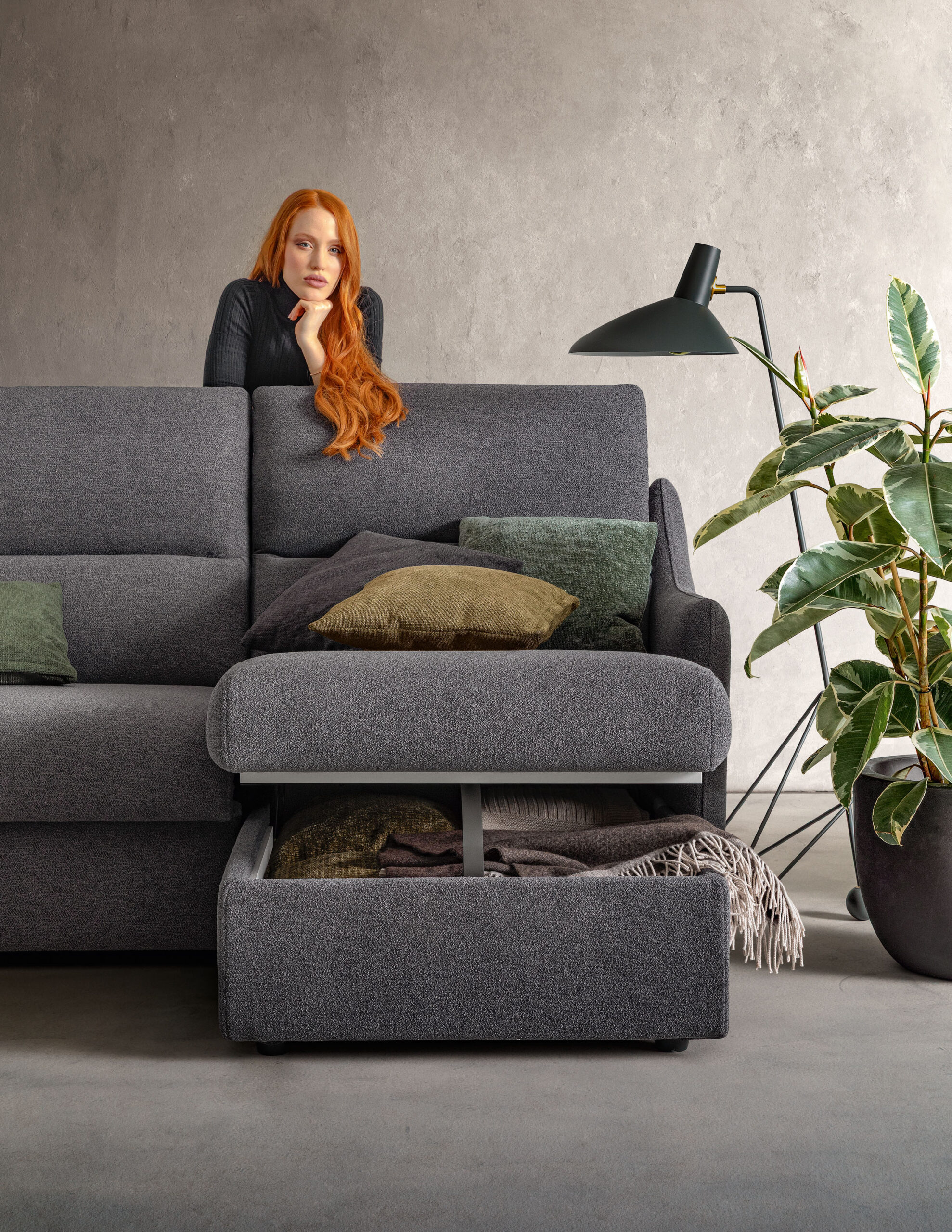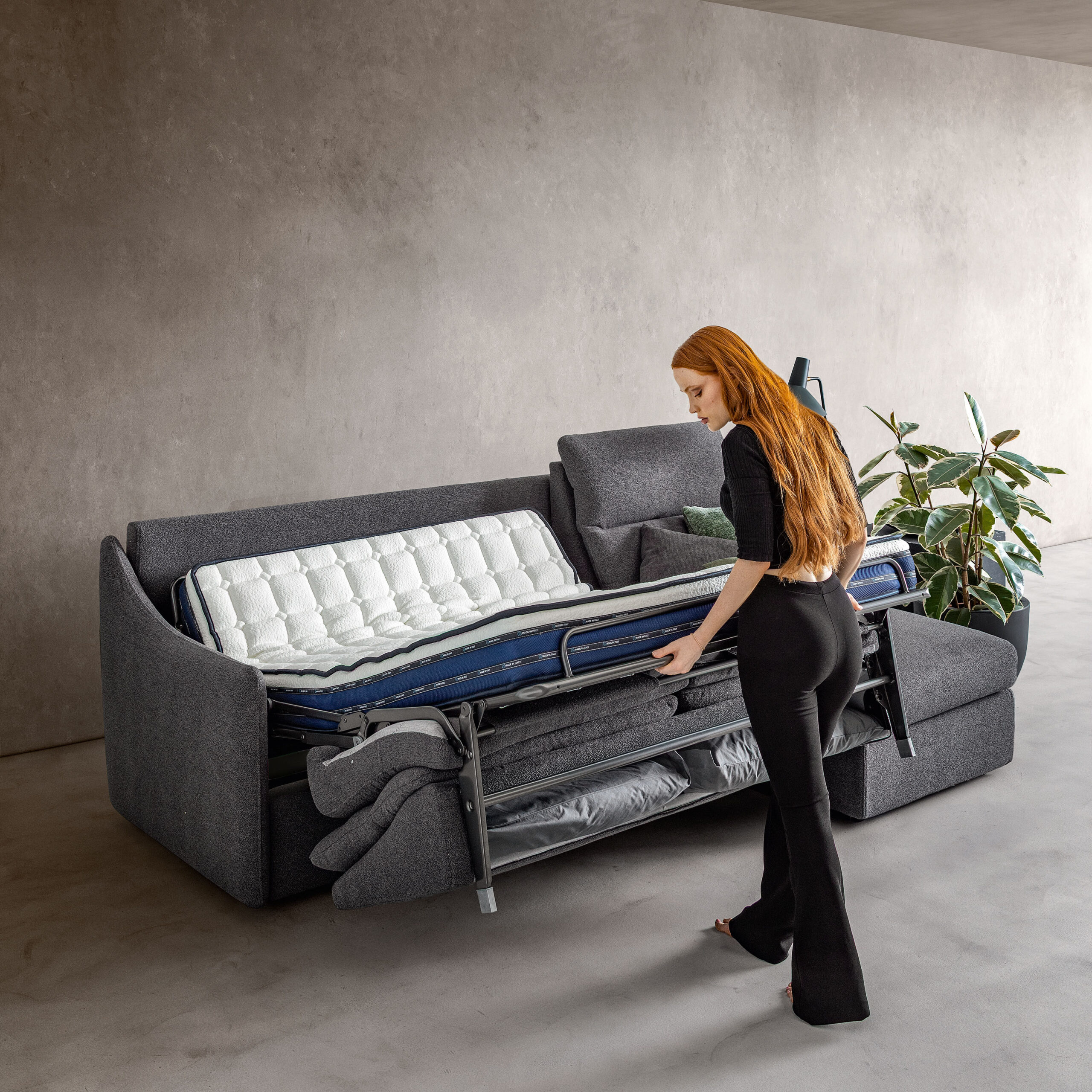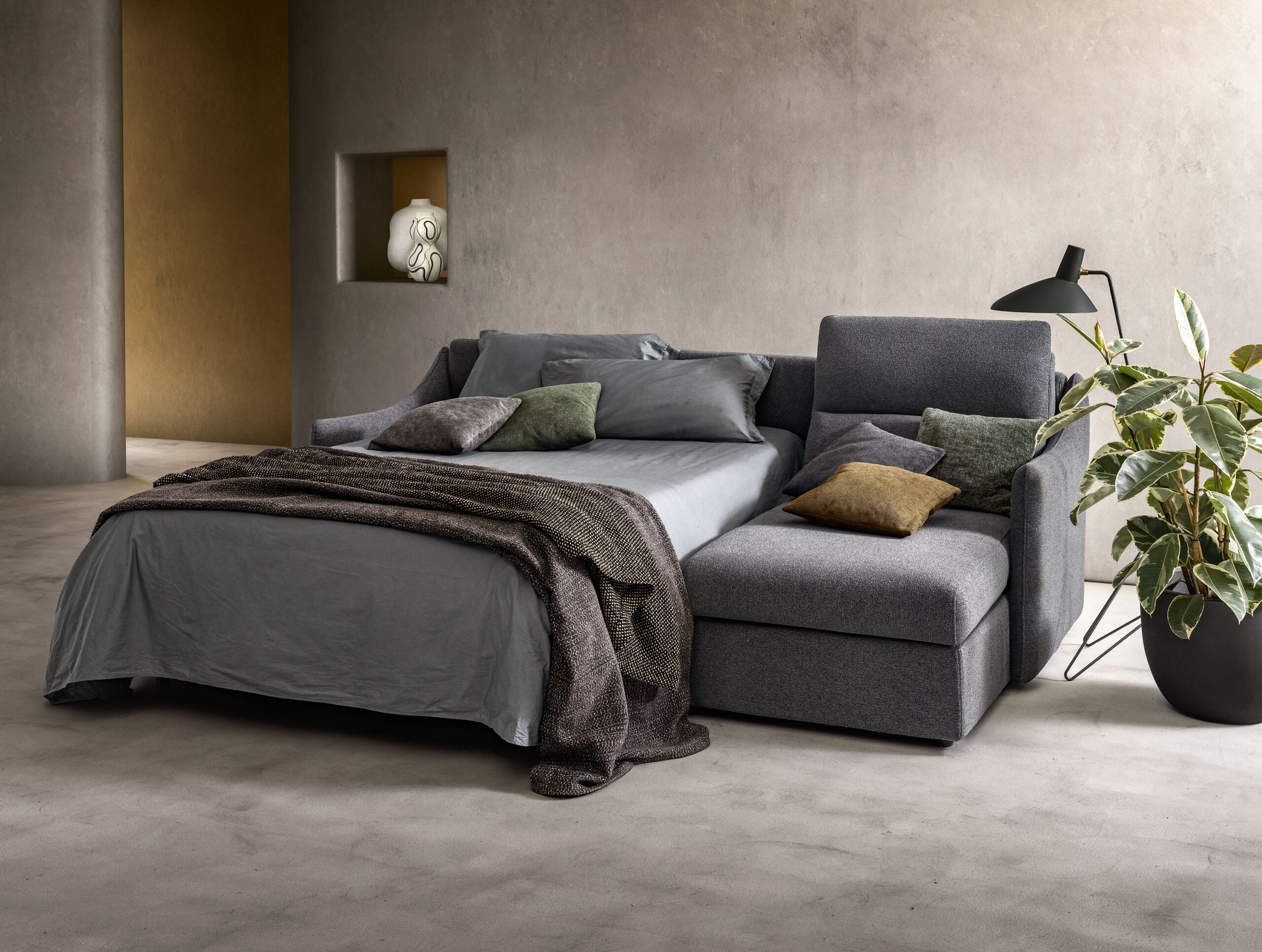 Divano letto trasformabile con meccanismo a ribalta ad apertura rapida, completo di materasso H 17 cm in poliuretano espanso indeformabile a portanza equilibrata.