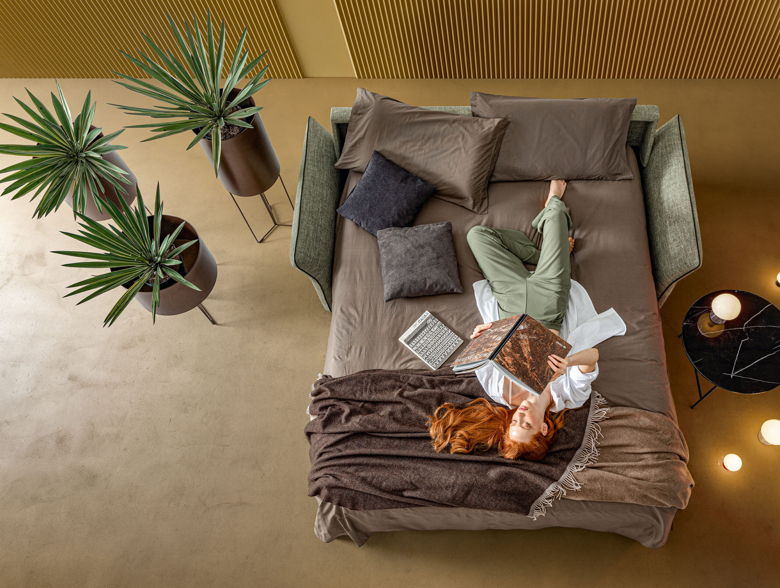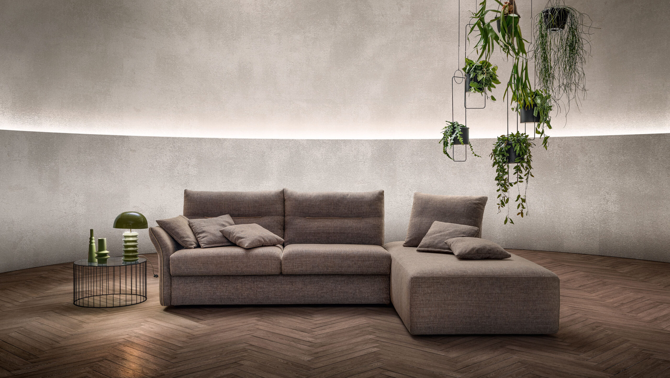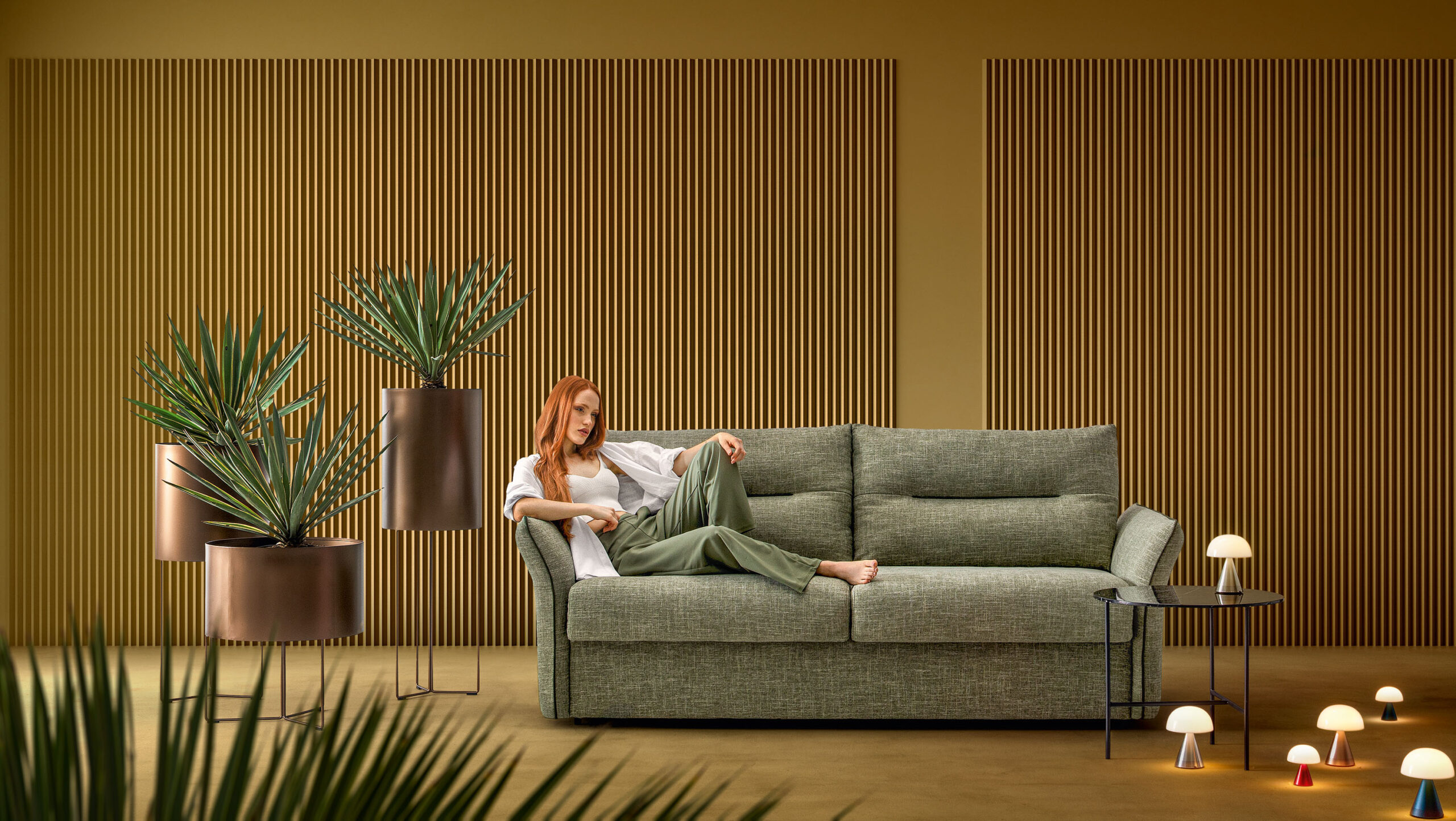Divano letto trasformabile con meccanismo a ribalta ad apertura rapida, completo di materasso H 17 cm in poliuretano espanso indeformabile a portanza equilibrata.