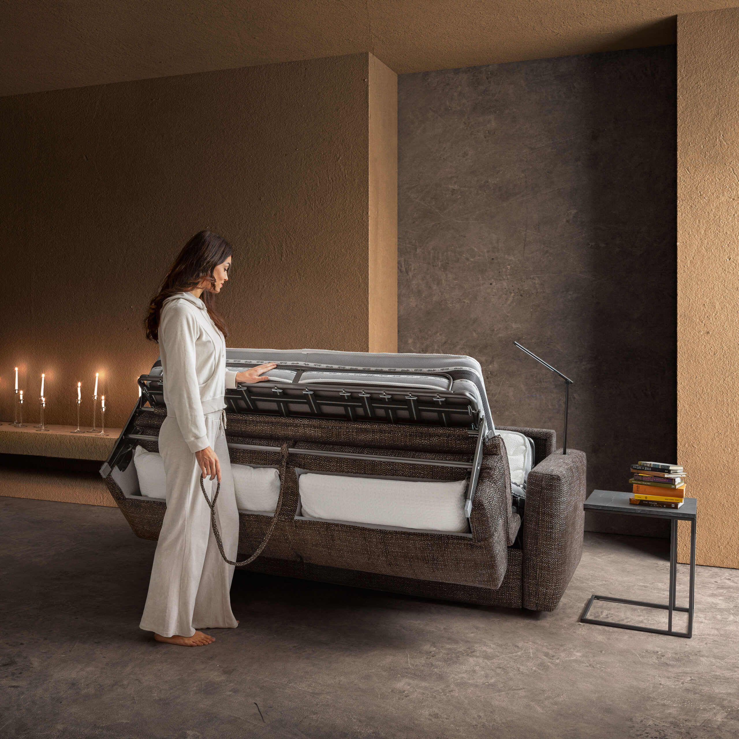 Divano letto trasformabile con meccanismo a ribalta ad apertura rapida, completo di materasso H 21 cm in poliuretano espanso indeformabile a portanza equilibrata.
