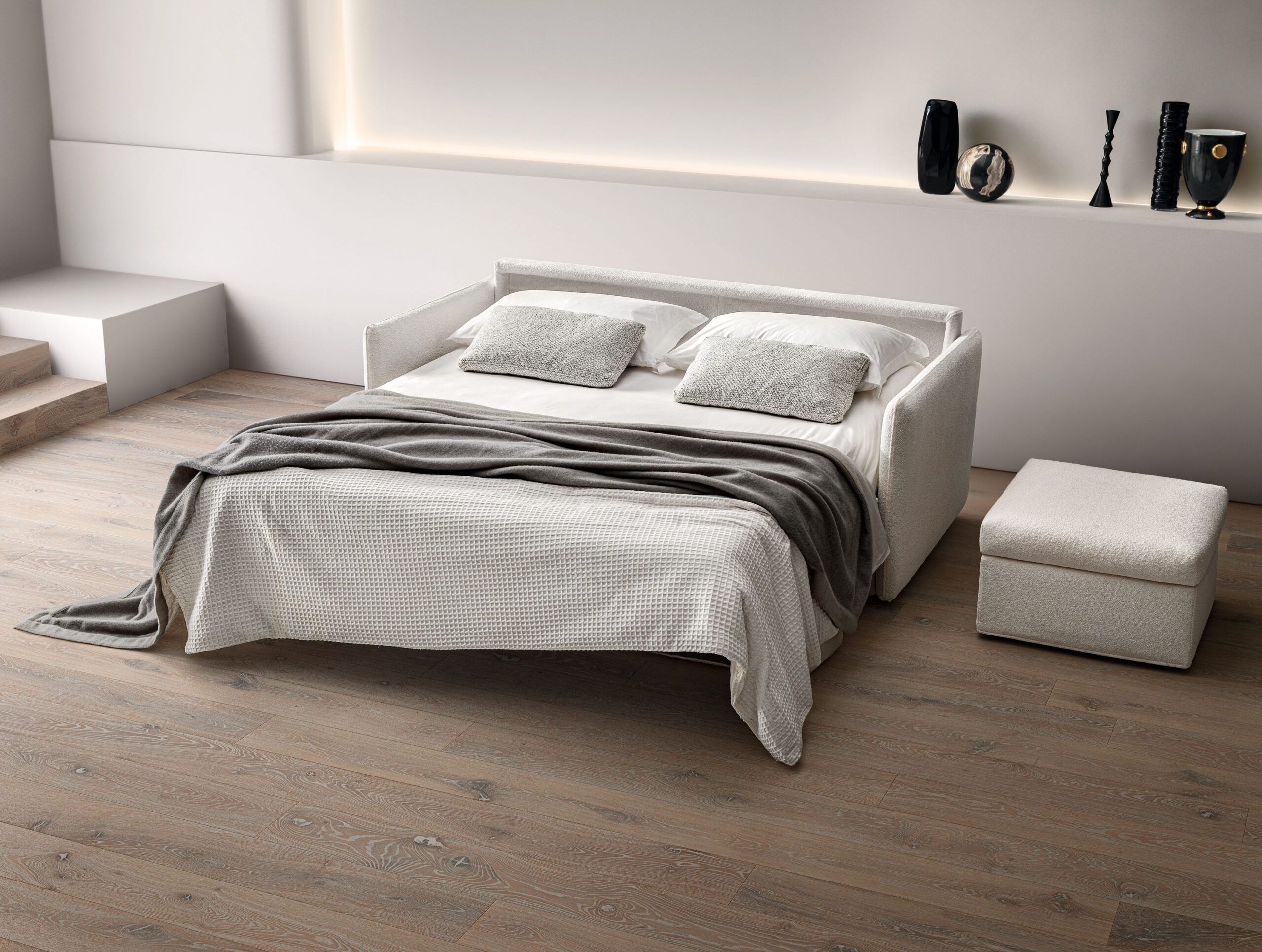 Divano letto trasformabile con meccanismo a ribalta ad apertura rapida, completo di materasso H13 cm in poliuretano espanso indeformabile a portanza equilibrata.