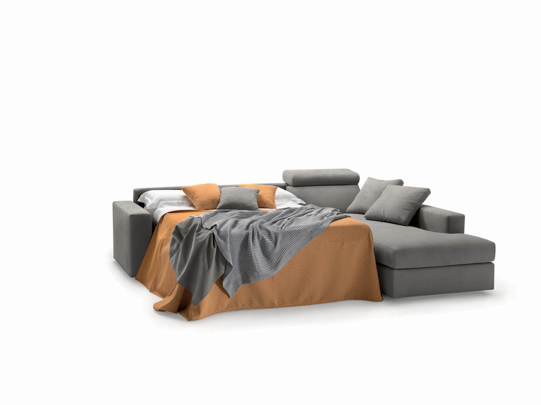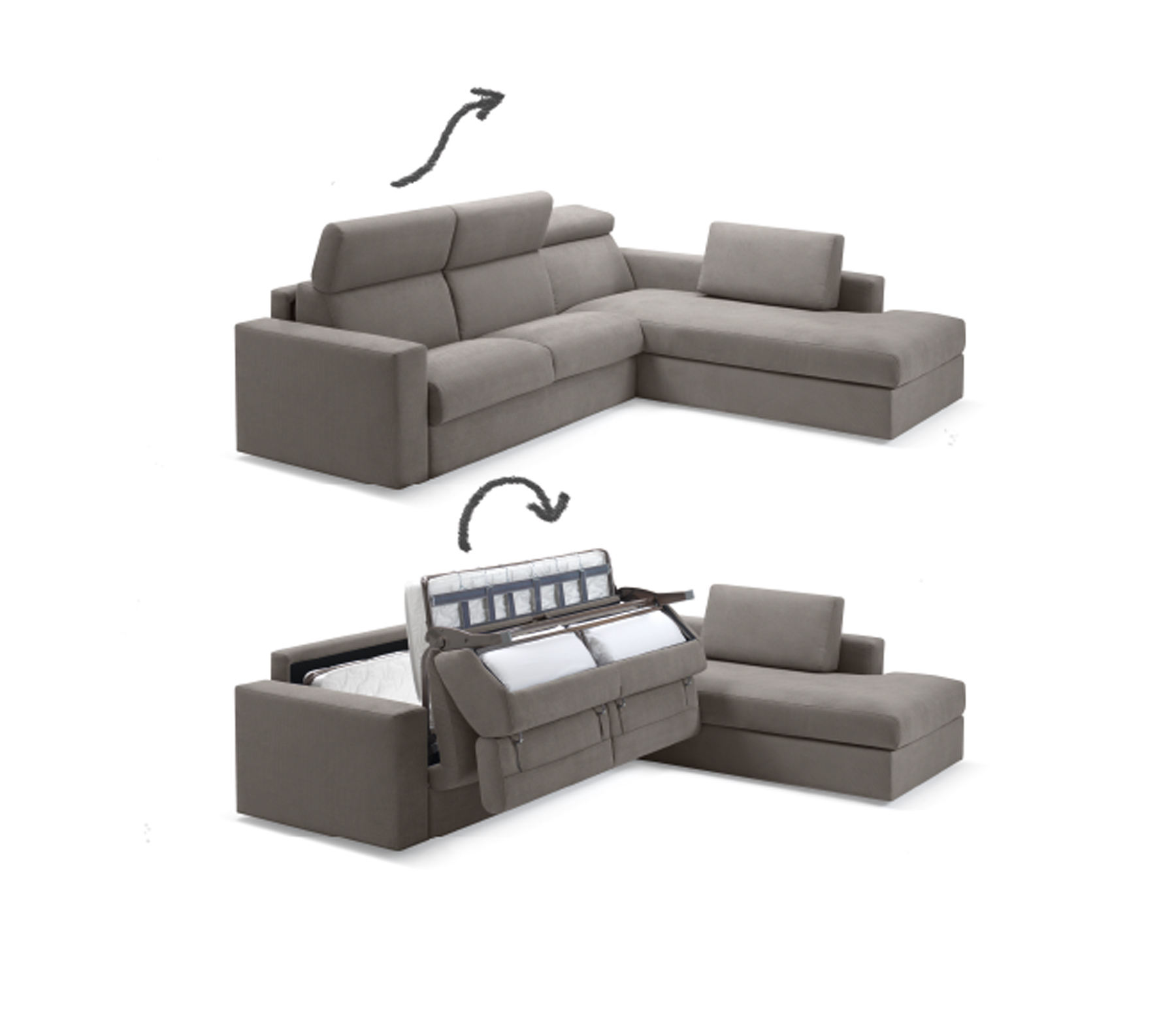 I divani della collezione SWAP AND CHANGE, con un semplice gesto, si trasformano in comodi letti. L’apertura è facilitata da una maniglia a scomparsa dello stesso tessuto del divano, posizionata tra i due cuscini schienale.