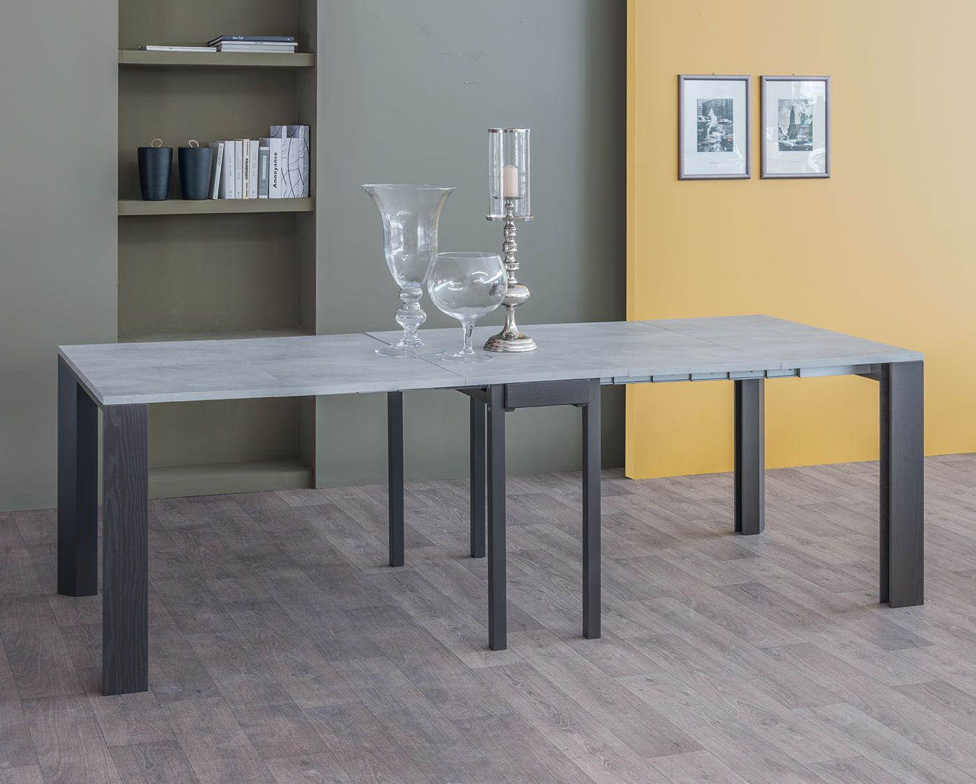Consolle con piano in melaminico, struttura e gambe in legno, guide in ferro