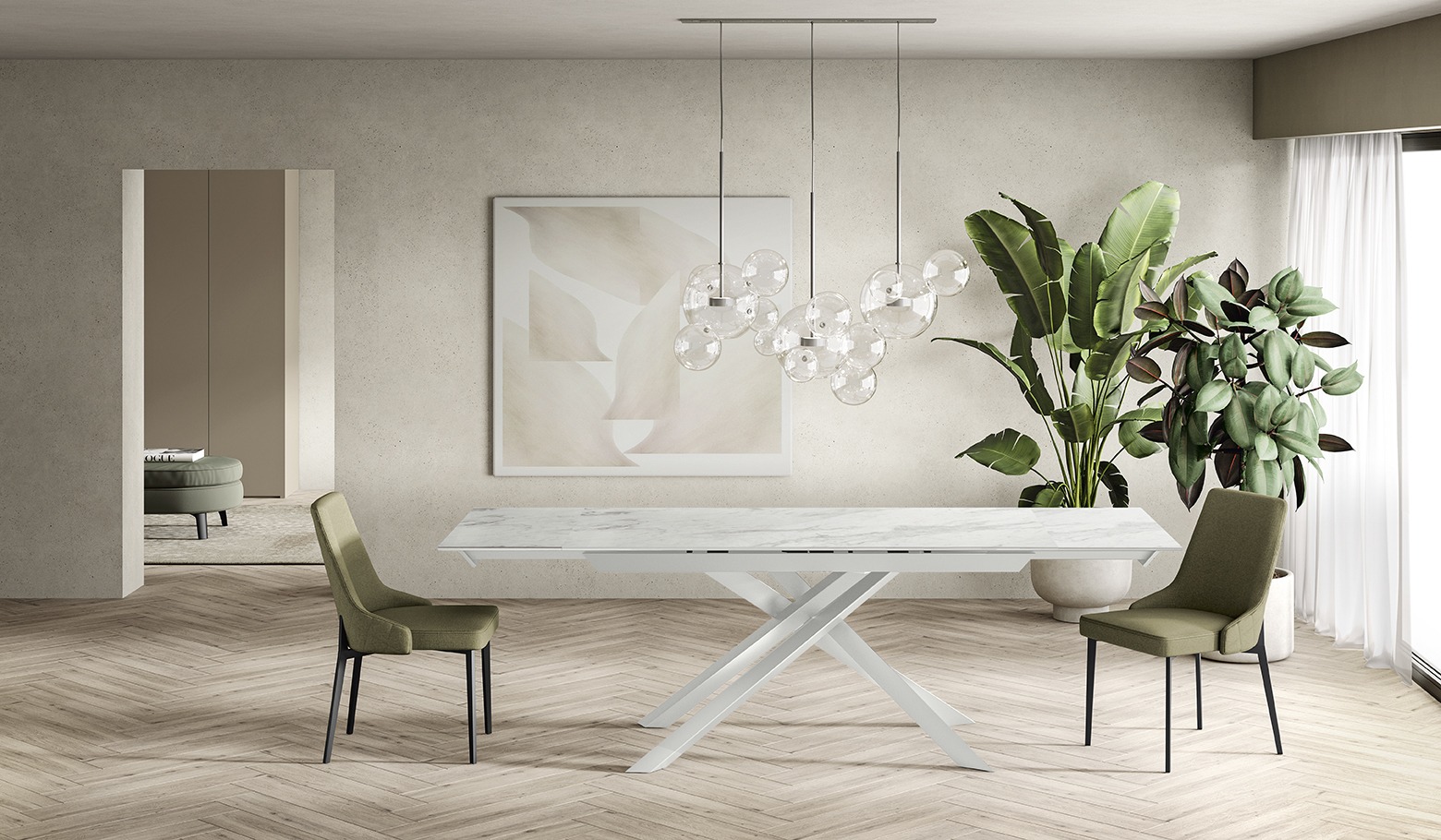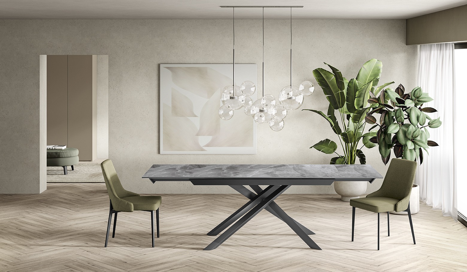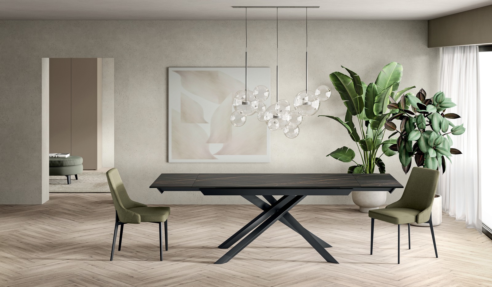 Il tavolo Cross unisce eleganza e design moderno. Con la sua struttura incrociata e il raffinato piano in ceramica su vetro, diventa il centro di ogni ambiente, aggiungendo un tocco di esclusività e stile