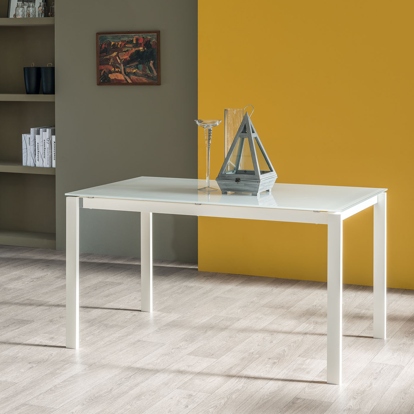 Tavolo con piano melaminico o vetro, basamento e gambe in ferro