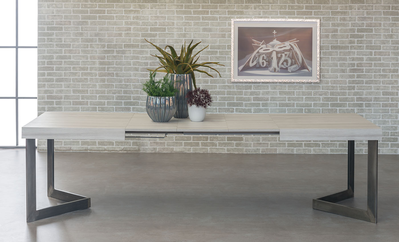 Tavolo con piano melaminico, basamento in metallo e gambe in ferro