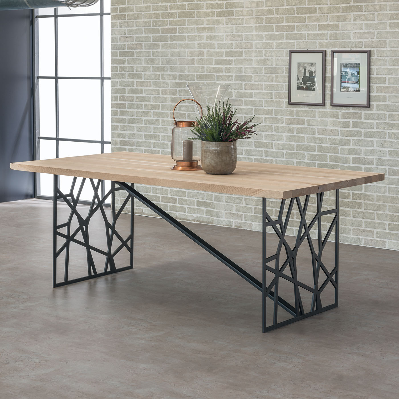 Tavolo fisso con piano in legno massello o vetro gress, basamento in ferro