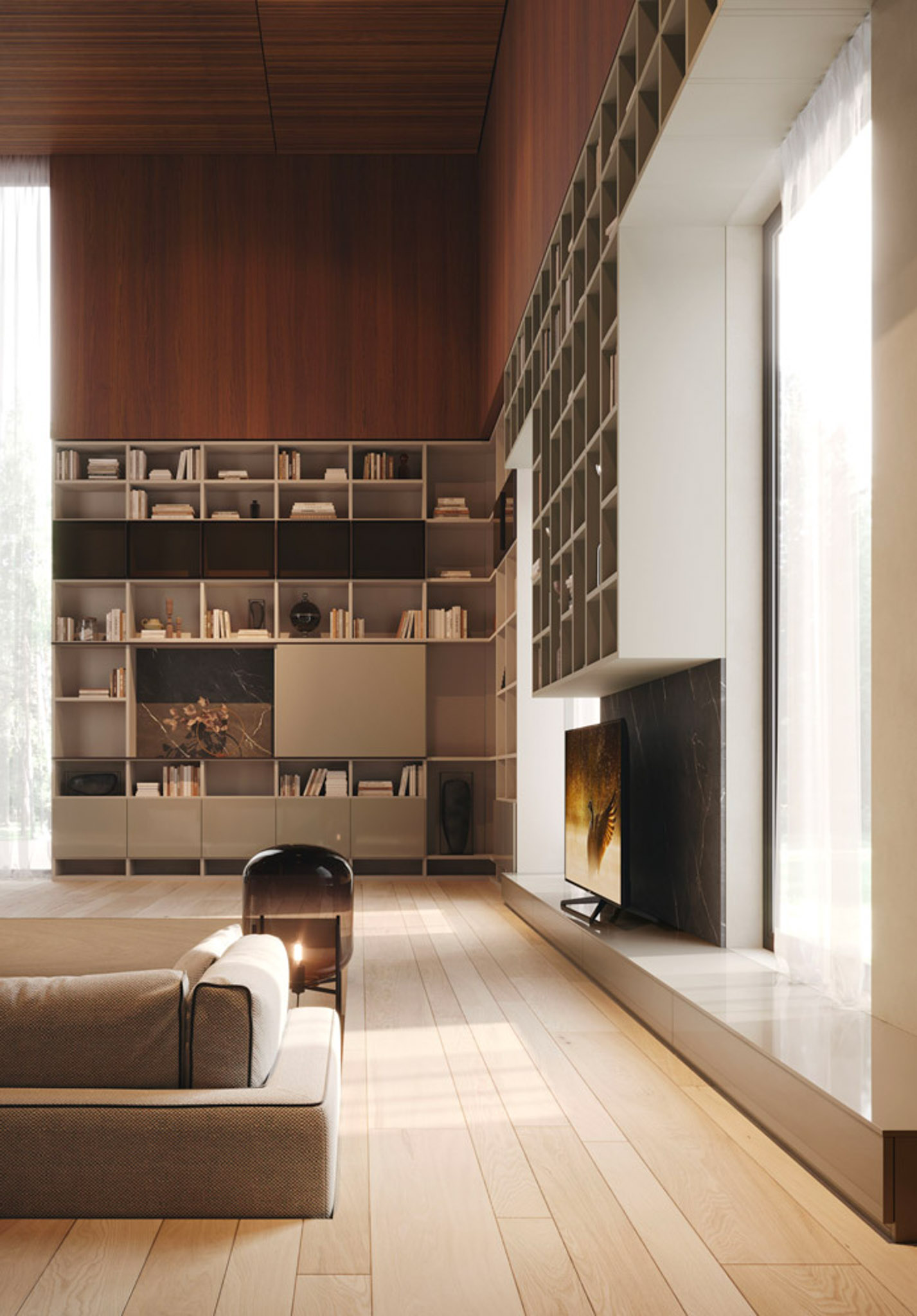 Libreria angolare laccato creta e fango, vetro reflex, nobilitato marquinia.