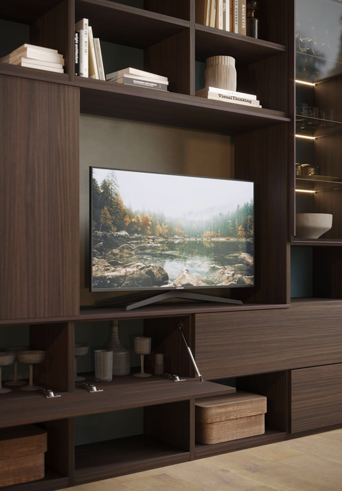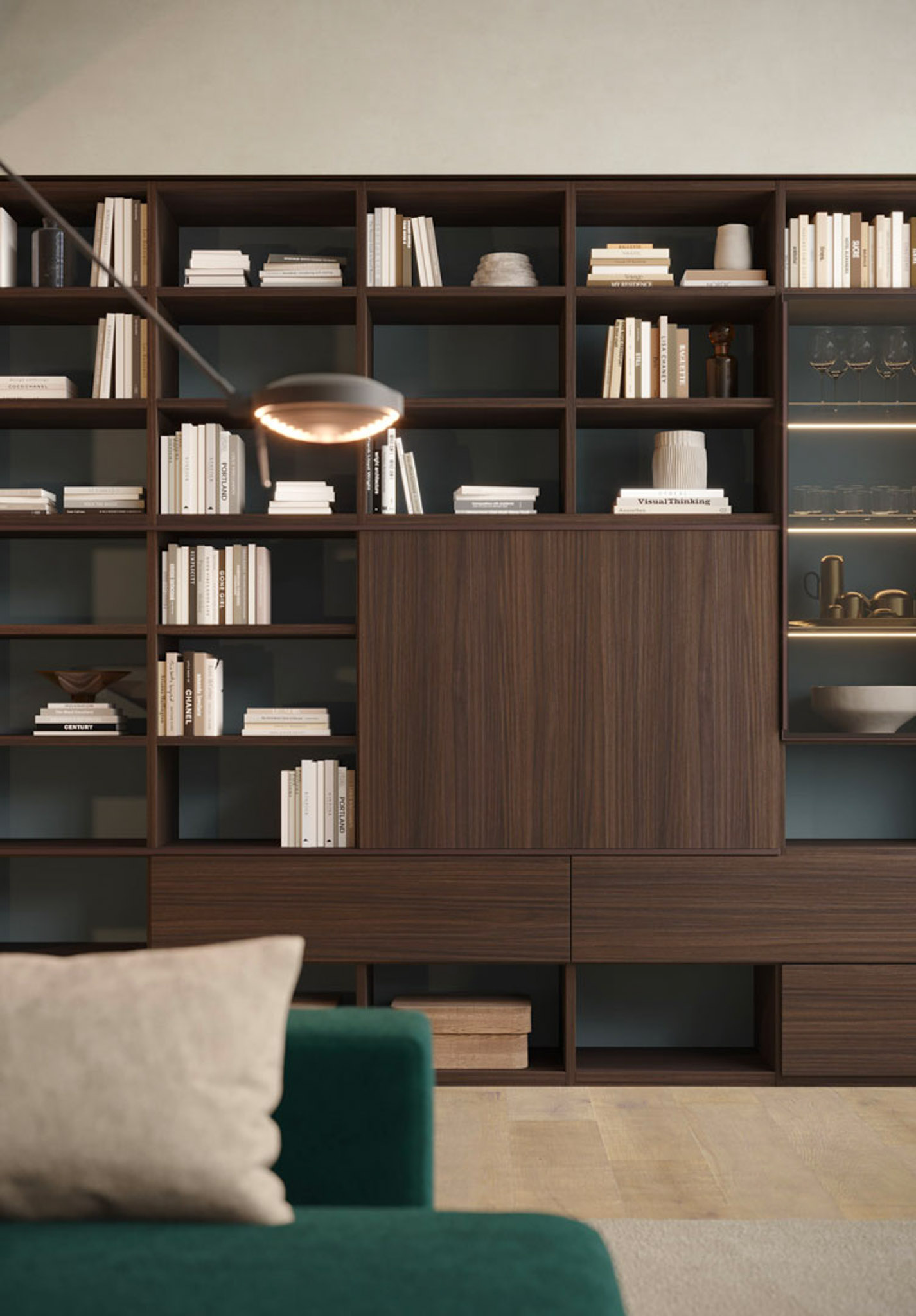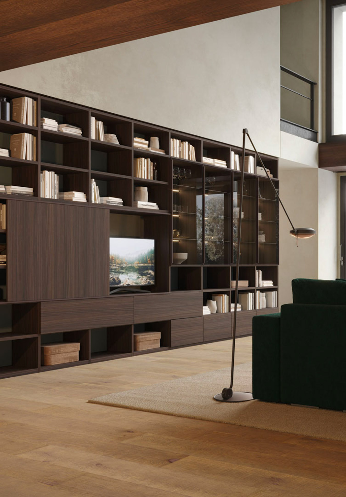 • Libreria lineare nobilitato teak, laccato liscio bristol, metallo brown, vetro reflex