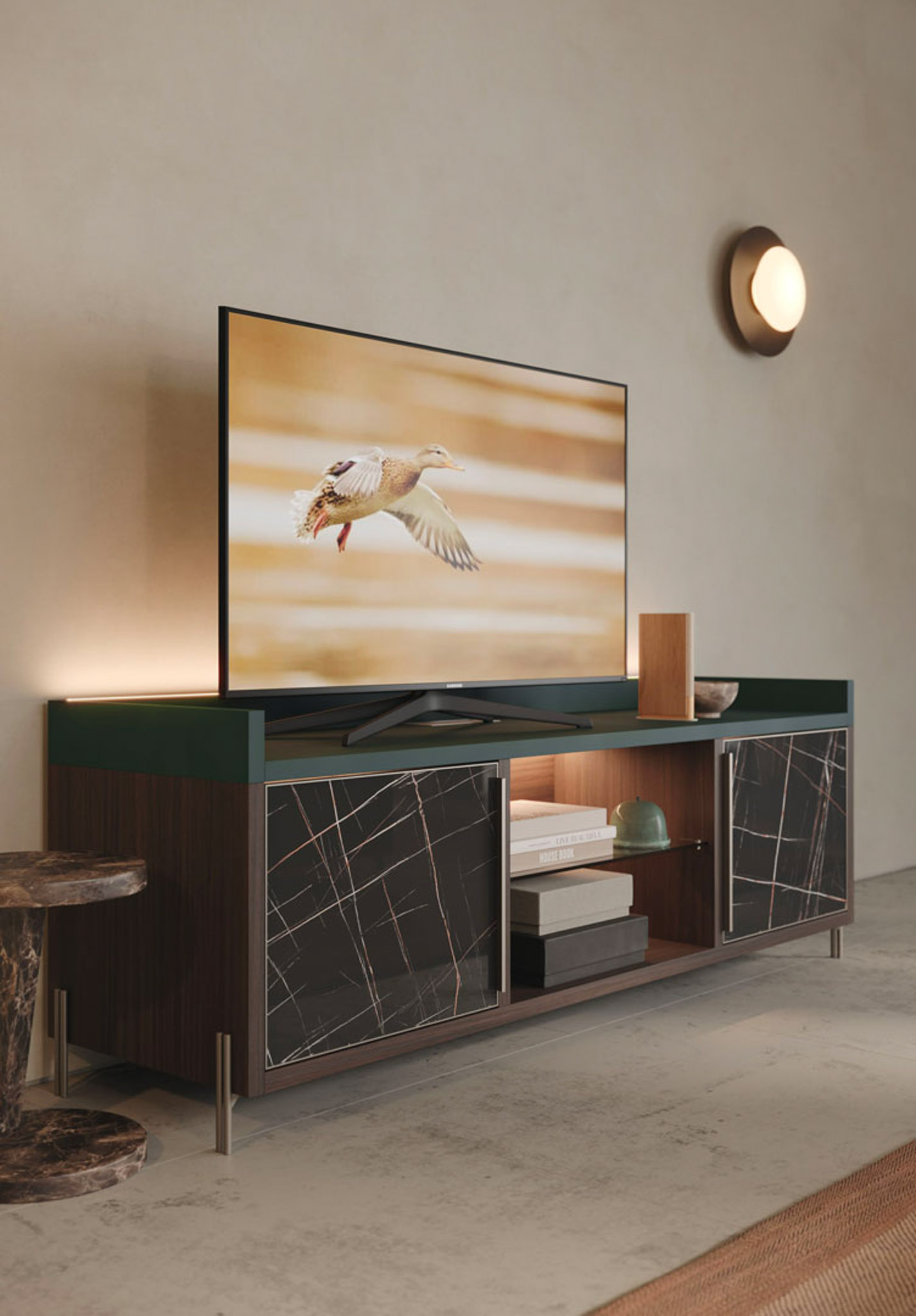 • Madia Freeda nob teak, laccato liscio pino, vetro sahara noir l207 p58,3 h73,8