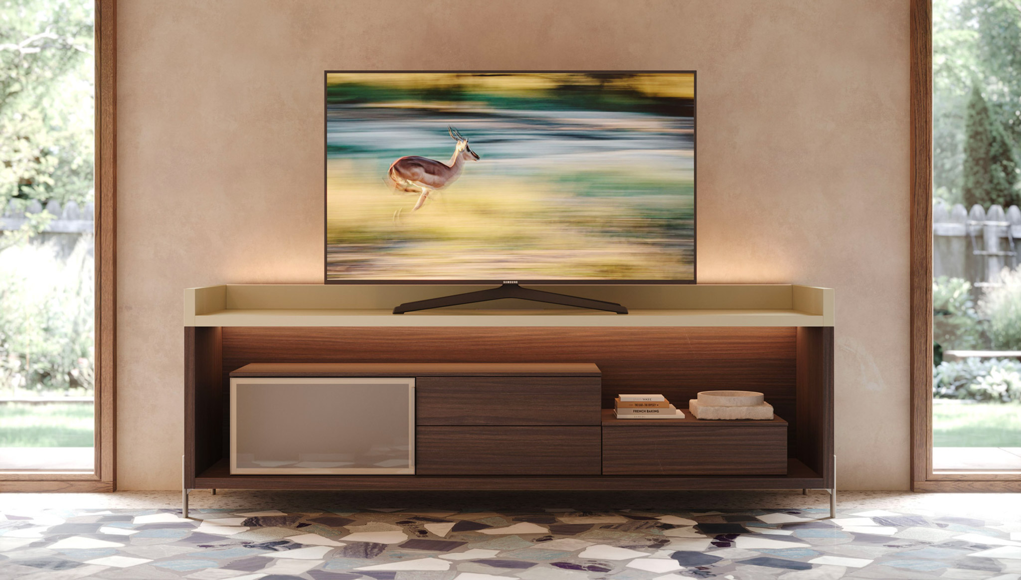 Madia Freeda nobilitato teak, top laccato papiro perlato, vetro bronzo satinato