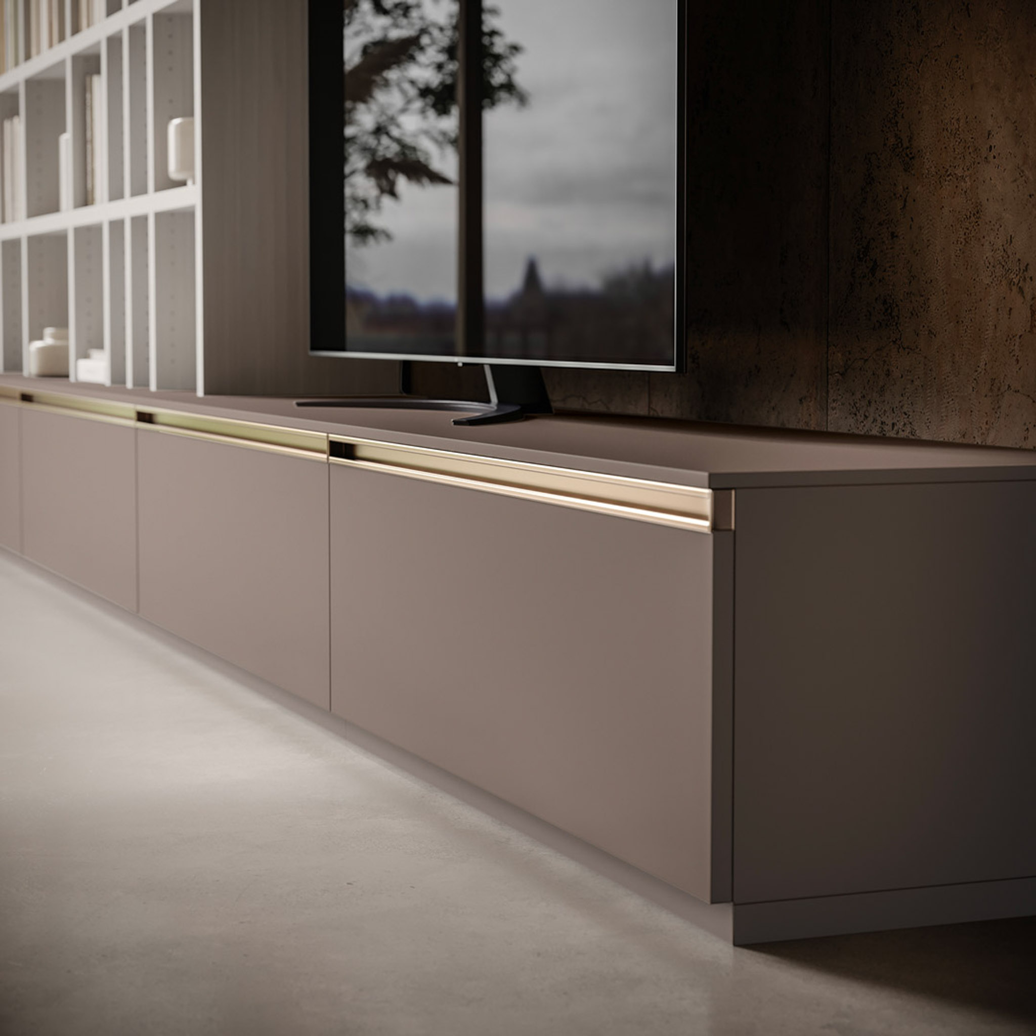 • Libreria lineare conpensili e cassettoni, nob. Nuvola, lacc liscio roccia, metallo rame L502,8 h227,2 p31,6/42