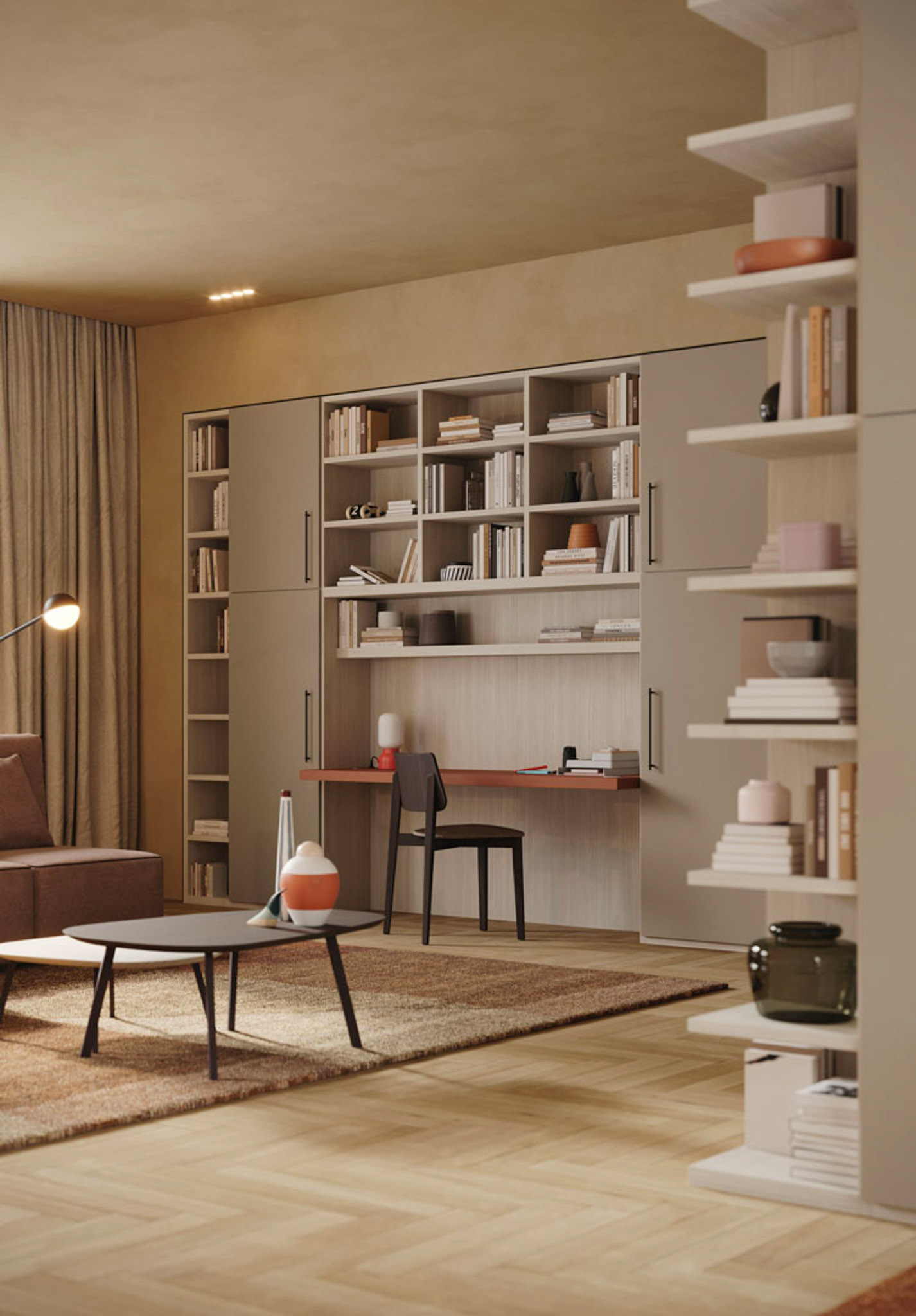 Libreria angolare nobiltato nuvola frassino, laccato liscio fango, metallo brown