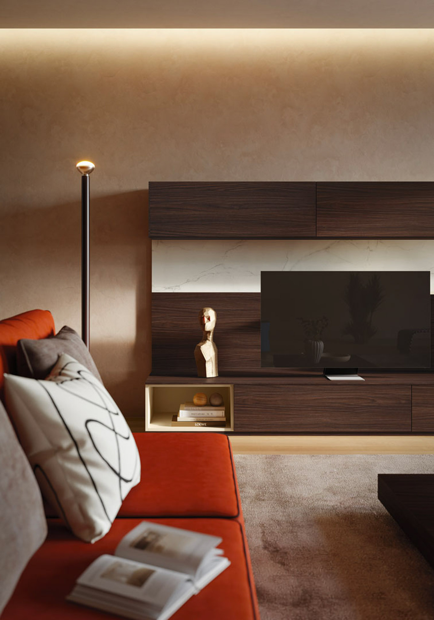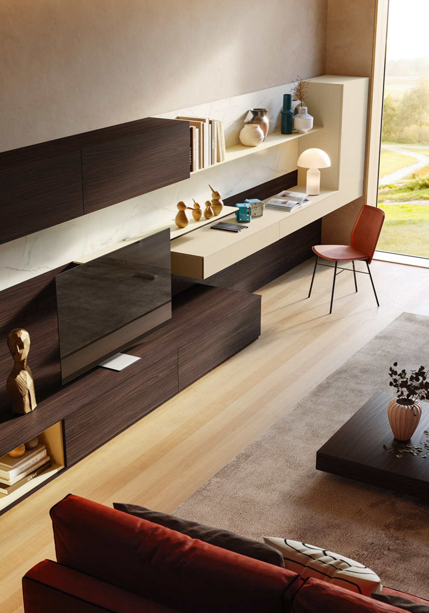 Composizione a parete laccato liscio creta, nobilitato teak, nobilitato michelangelo