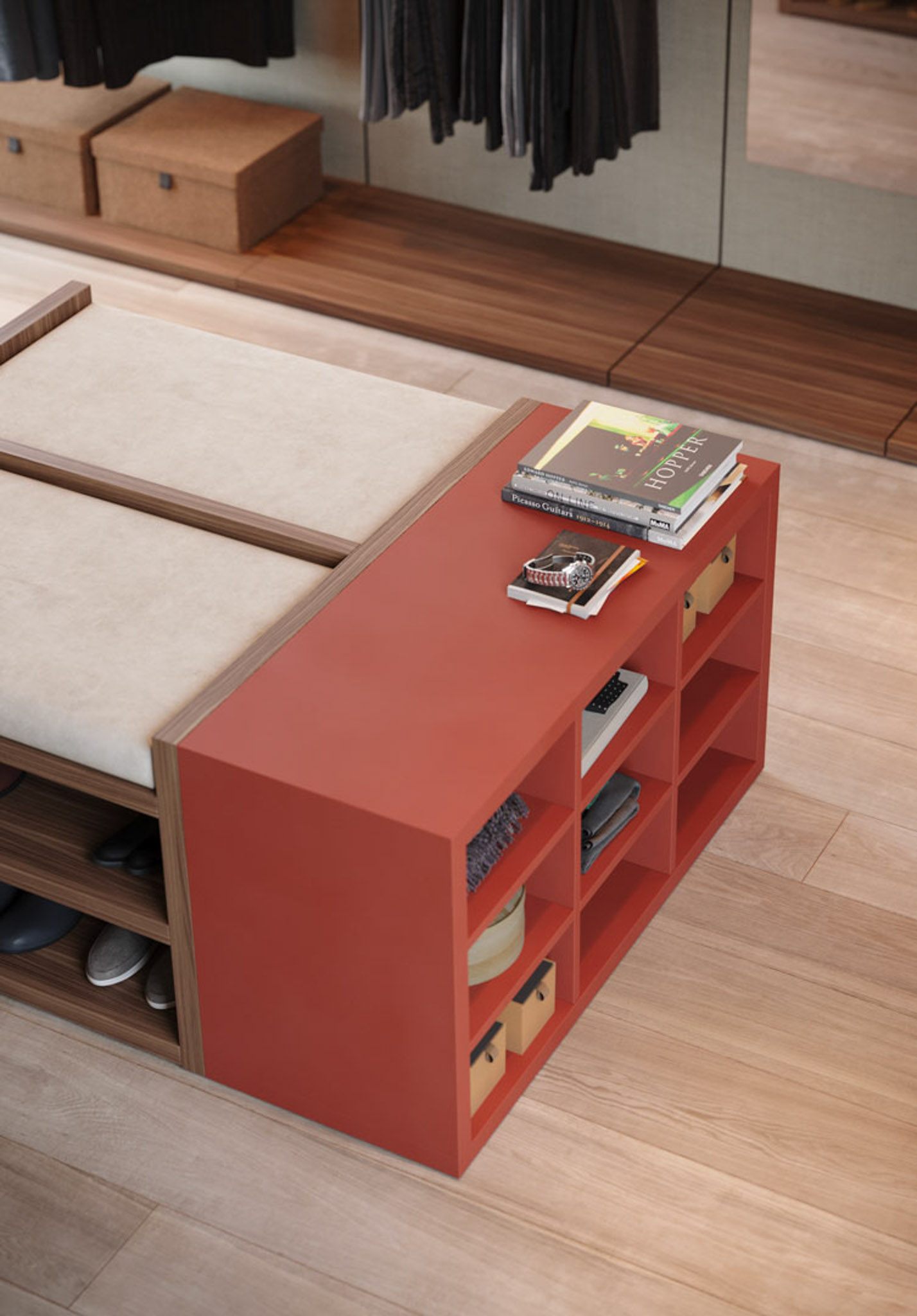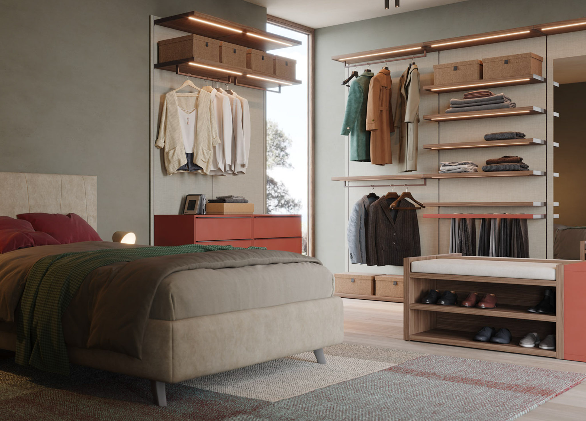 Finiture laccato liscio brick, nobilitato noce java, nobilitato lino, metallo brown