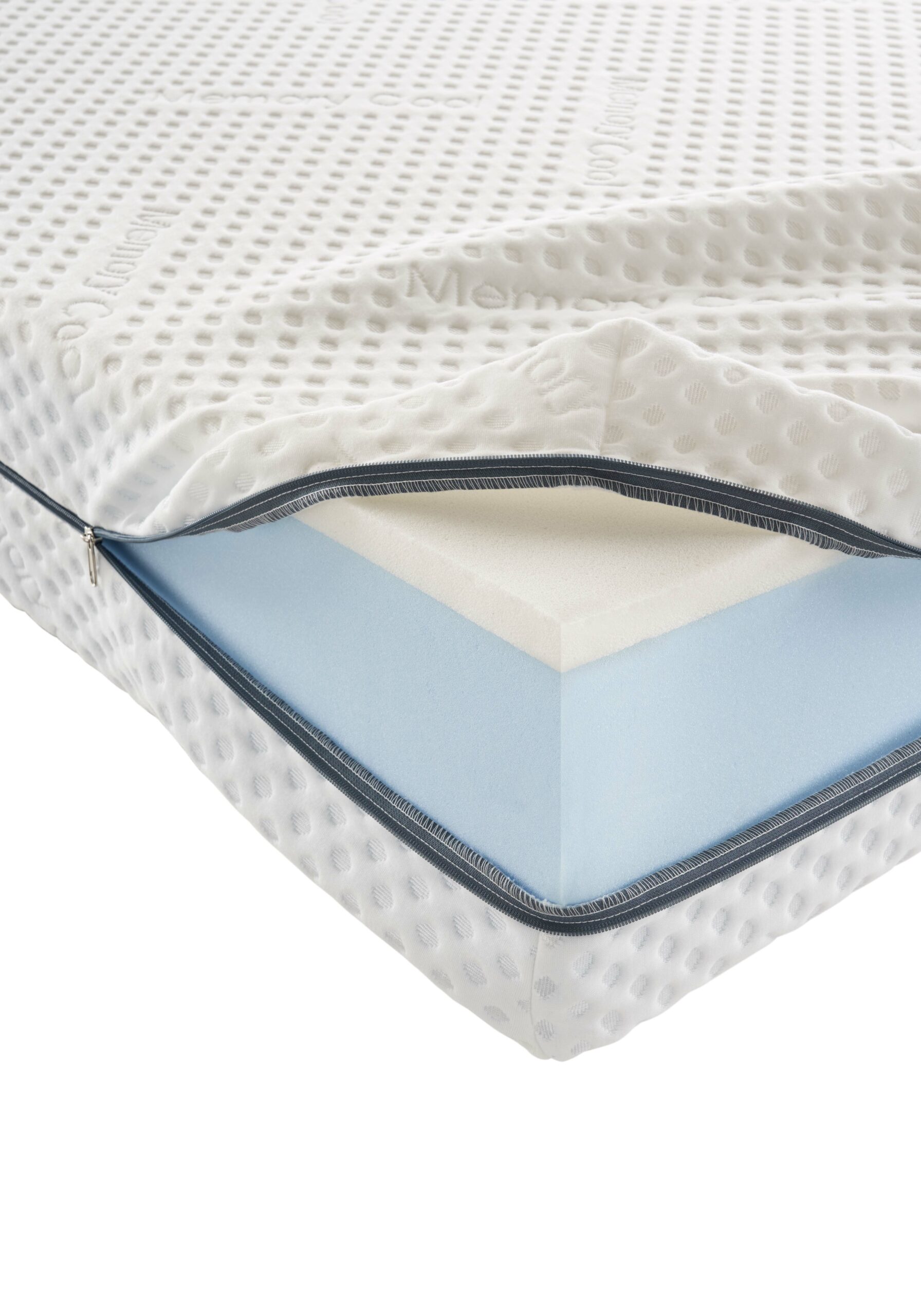 Memory altezza 2 cm densità 40 kg/m3, Eliocell altezza 18 cm densità 23 kg/m3. Maglina elastica interna di protezione.